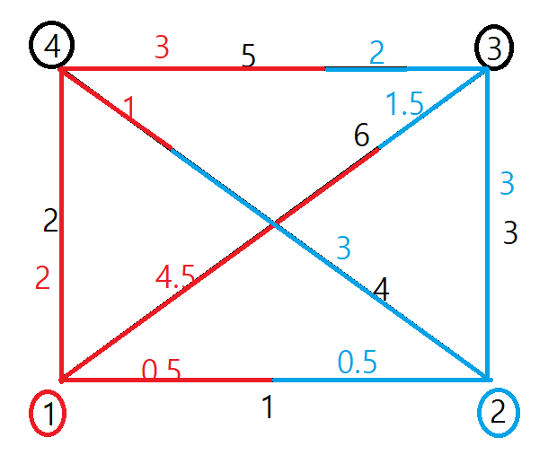 1, 2가 각각 정점집합에 포함된 정점이고 검은 수가 해당 간선의 총 길이일 때 간선들은 붉은색(1에 포함됨)과 푸른색(2에 포함됨)으로 나뉜다.