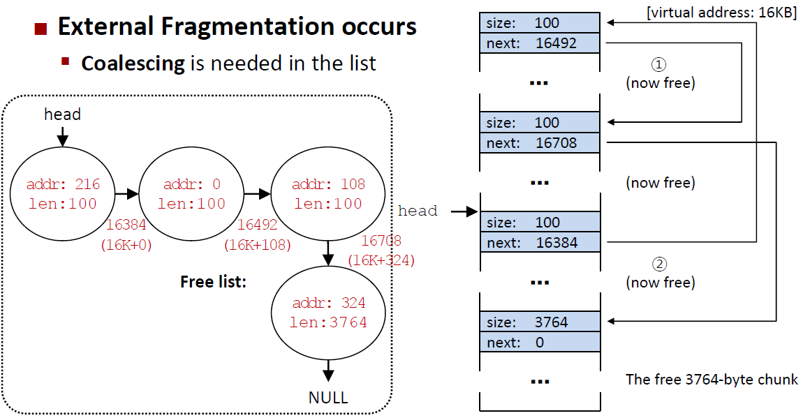 External fragmnetation : free space가 non-contiguous하게 배열된 경우, OS의 메모리 할당이 어려움