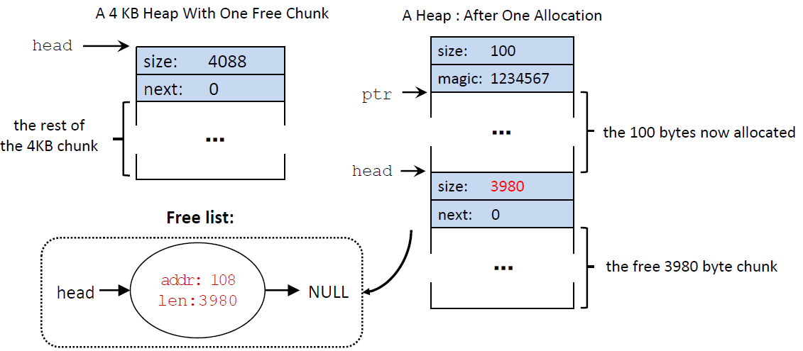 Addr값은 Header의 pointer값, len은 size값, Header의 next값은 기존 head->next값의 offset(=addr)