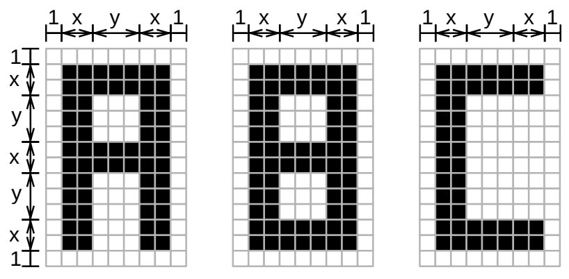 '.'과 '#'으로 이뤄진 2차원 맵이 주어질 때 아래의 그림과 같은 A, B, C가 몇 번 나오는지 구하여라