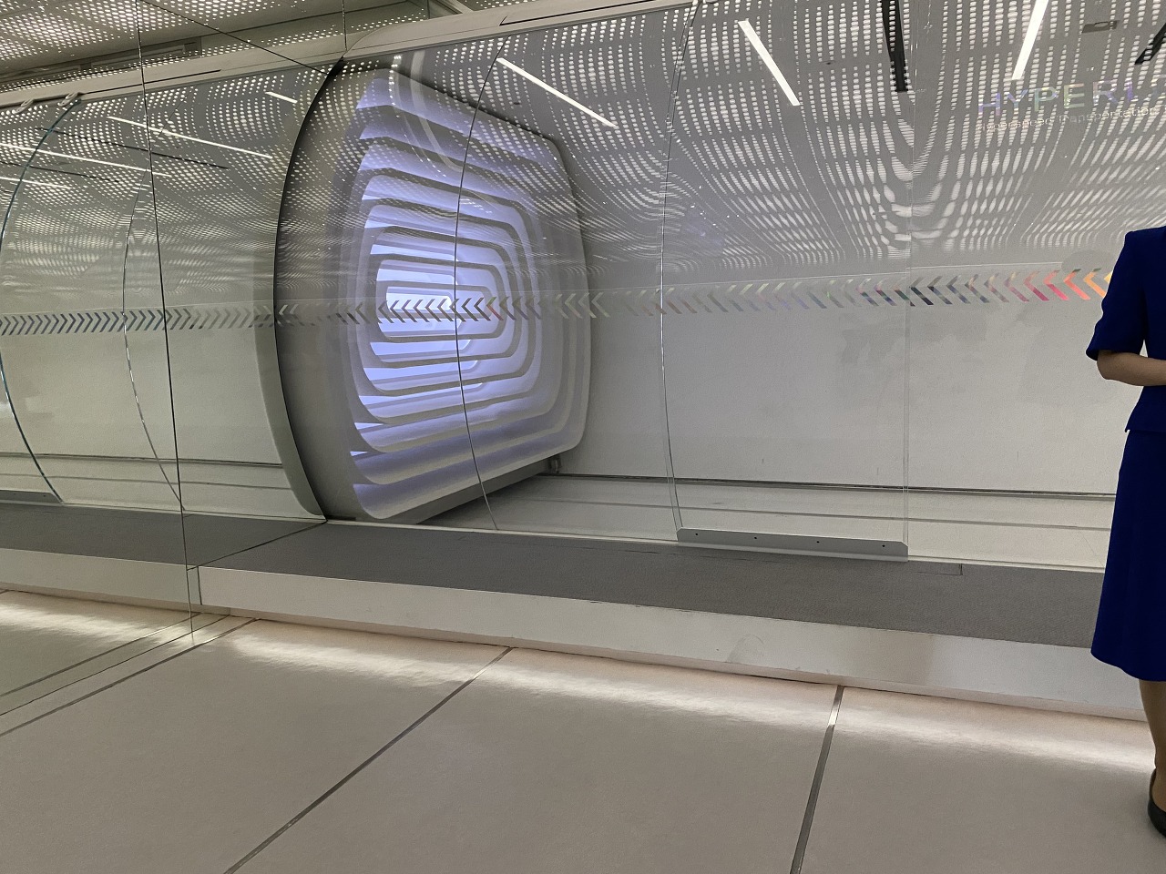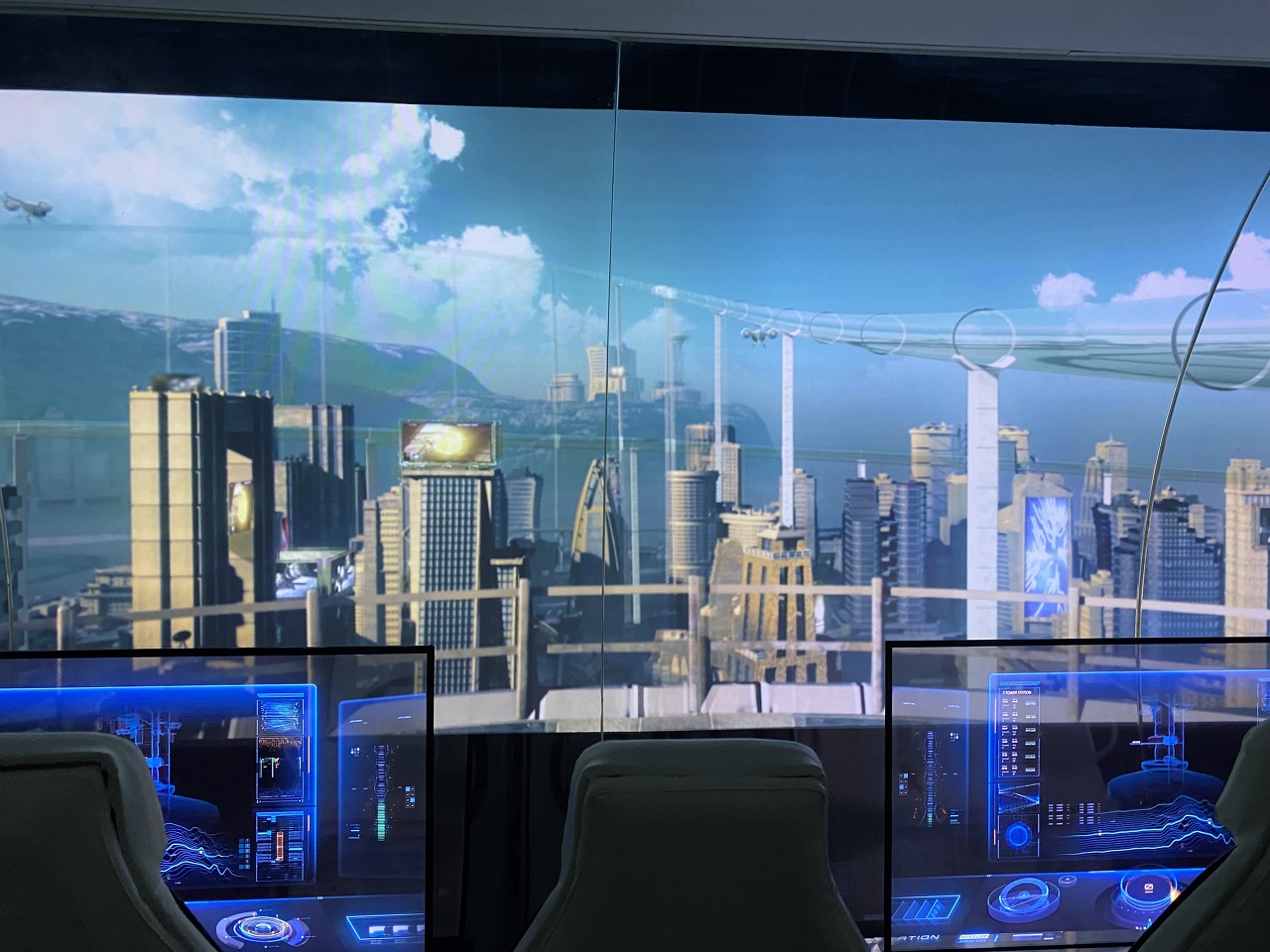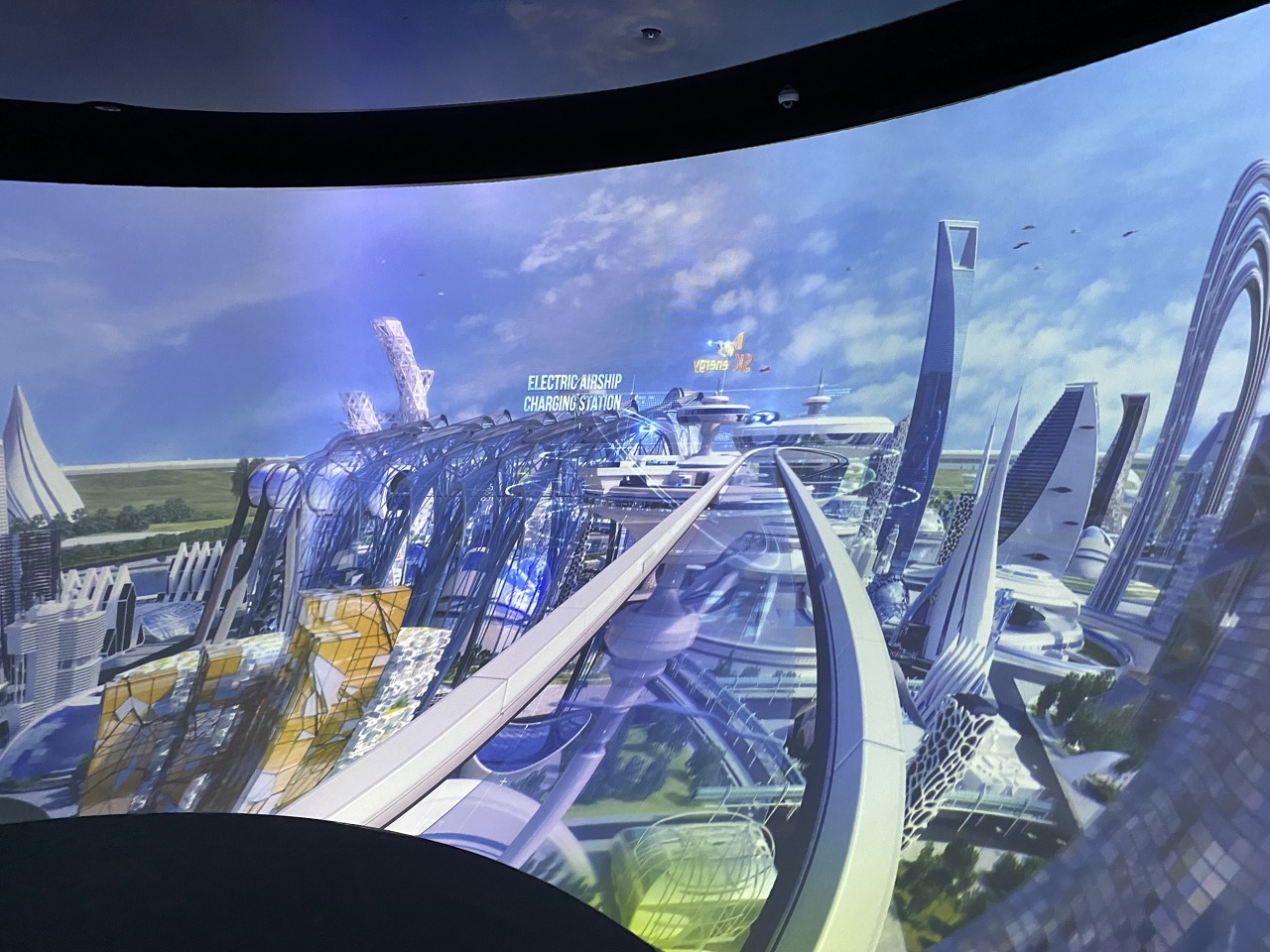 원통형 열차 비슷한 걸(하이퍼루프) 타고 지나가면서 4D로 도시 경치를 볼 수 있었다.