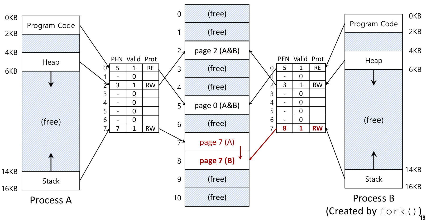 프로세스 B의 값이 수정되는 경우 해당 페이지의 값이 copy 된 후 새 페이지에 write된다