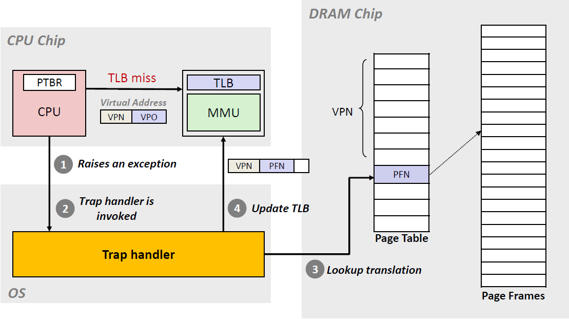 1. H/W raise exception : - 1. 현재 instruction 정지 - 2. kernel mode로 변경 - 3. trap handler로 이동 2. OS의 traphandler 작동 3. OS가 page table의 translation 확인 4. OS가 special privilaged instructions로 TLB Update 5. OS가 trap에서 돌아옴 6. H/W가 Instruction 재시도 |