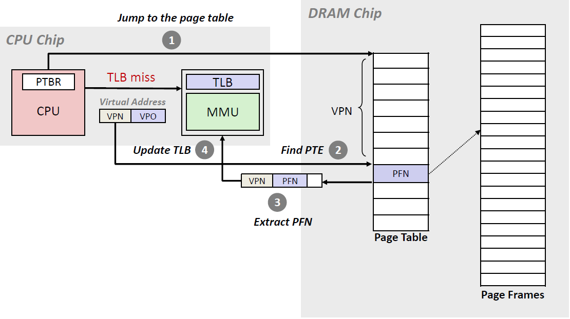 | PTBR(page-table base register)이 page table을 가리킴 e.g. CR3 register in X86 1. 현재 page table로 이동 2. 알맞은 PTE 찾기 3. Desired Translation 추출 4. TLB를 Translation으로 Update 5. Instruction 재시도 |
