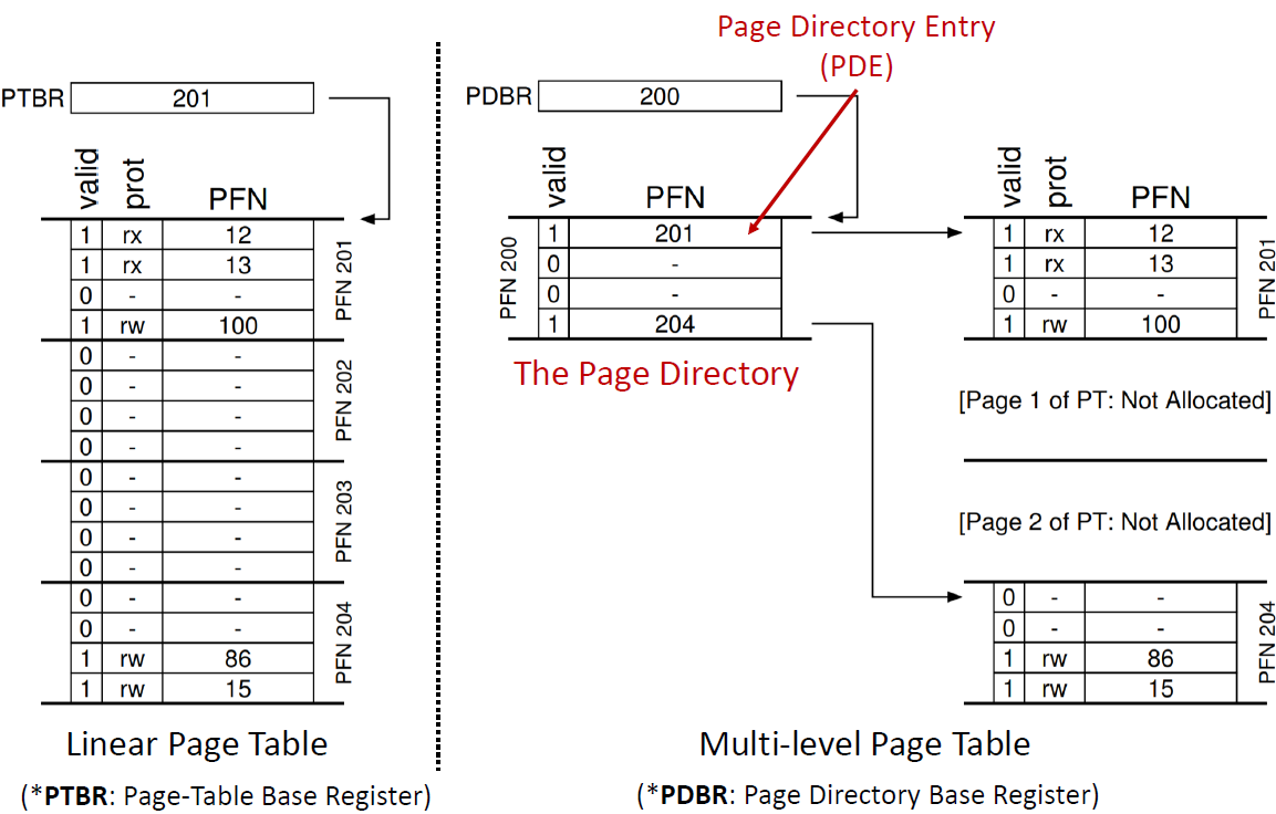 multi-level의 경우 VPN 앞쪽 bits가 PDE(Page Directory Entry)이고, 뒤쪽 bits가 PTE(Page Table Entry)이다.