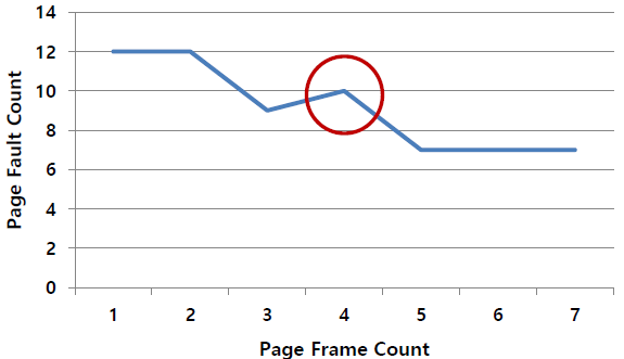 일반적으로 cache크기가 커지면 hit rate가 증가함 그러나 FIFO는 가끔 page frame이 커져도 더 낮은 hit ratio를 보임