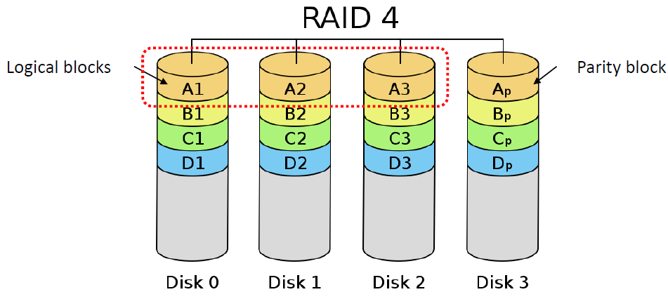 n-1개 disk에는 각 data를 넣음, 마지막 disk에는 각 disk data를 xor시켜둔 parity block을 둠