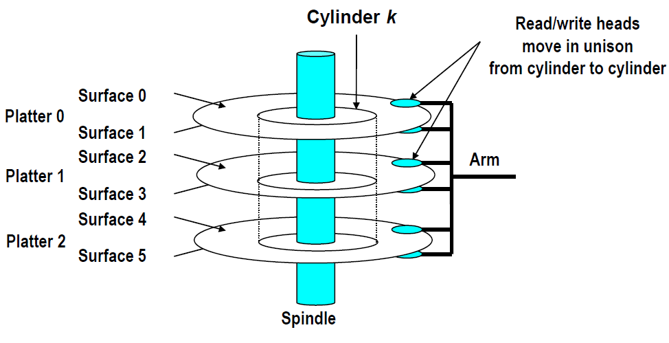 read/write head : arm 끝에 달려서 disk surface를 얇은 air cushion을 두고 읽음. arm에 의해 track이동