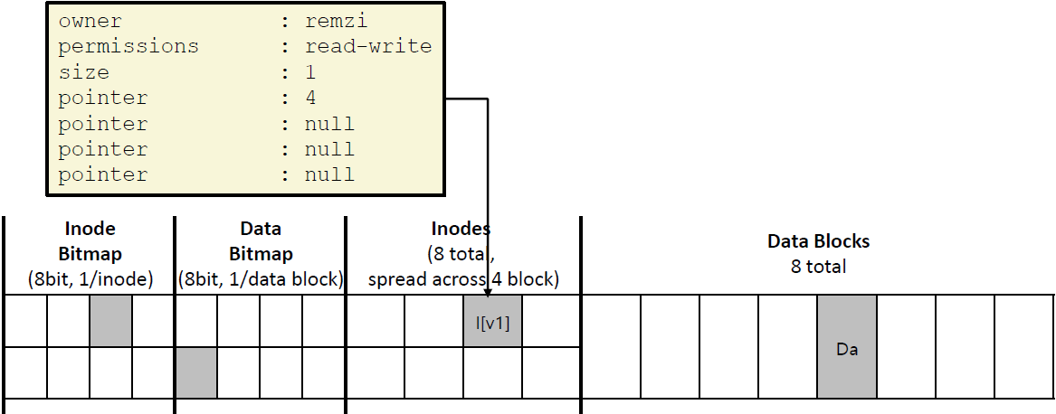 | 기존 file 크기는 1 첫 direct pointer가 4(Da)를 가리킴 나머지 3개는 null |