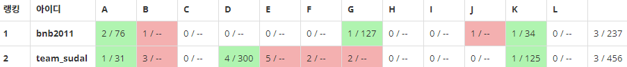 그 때문인지 아쉽게도 G를 대회 종료 1분 후에 맞혔다. 이번에야말로 team_sudal이 1등 할 수 있었는데 ㅠ
